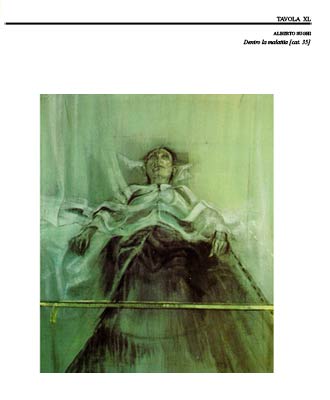 Se la figura umana costituisce letiv motiv dell'intera di Alberto Sughi, il dipinto Dentro la Malattia e’ un esempio emblematico del piu’ specifico interesse per la sofferenza umana che l’artista comincia a dimostrare nelle sue opere a partire dalla fine degli anni Cinquanta. Dopo un avvio da autodidatta, scaturito da un'istintiva passione per la pittura, ed una prima ricerca di nuovi contatti nel 1946 a Torino, Sughi si trasferisce a Roma alla fine degli anni Quaranta, divenendo presto uno degli esponenti di spicco della pittura neo-realista. Ma, mentre in questi anni a dominare sono le tematiche legate alla Resistenza da un lato e l'attenzione per i diversi aspetti della vita moderna dall'altro, dal 1956 inizia a prendere corpo nei suoi dipinti quella nuova tendenza espressiva che Enrico Crispolti definirà "realismo esistenziale" (in Levi 1986, p. 24) e che, arricchita e trasformata nel corso del tempo da ulteriori stimoli, rimane a tutt'oggi il tratto dominante del pittore cesenate. Proprio Dell'ambito di questa nuova propensione per l'analisi della condizione dell'uomo contemporaneo, nascerà, nel corso degli anni Settanta, una vera e propria teoria di grandi cicli pittorici, ispirati alla vita di tutti i giorni, come La Cena, II Teatro d'Italia, La sera e la Riflessione, che rappresentano delle vere e proprie metafore della societa’ contemporanea. Ma prima di questi e parallelamente ad essi. Sughi porta avanti una linea d'indagine più "sotterranea" sulla natura del dolore di vivere, alla quale appartiene a pieno titolo Dentro la malattia. Un'opera eseguita nel 1964 che l'artista ricorda: "mi fu suggerita da una vicenda personale, che sembrava aver messo in pericolo la mia vita". Affiancato da altri soggetti simili - Uomo nudo sul letto. Uomo coricato - ugualmente realizzati al principio degli anni Sessanta, quando l'immagine spesso si concentra su un solo personaggio, il dipìnto trae, dunque, origine da un fatto autobiografico, ma da esso si allontana per diventare simbolo del "sentimento della malattia dell'uomo mo derno, che vive in un'ansietà derivante da un'idea di fine non illu minata da valori alti". Questo è il senso profondo dell'immagine e insieme il motivo per cui, quando Sughi ha deciso nel 1999 di donare un suo quadro ai Musei Vaticani, ha "preferito Dentro la malattia ad un soggetto apertamente religioso". Perché in quest'opera sono evocati gli effetti angosciosi che la mancanza di punti di riferimento può generare di fronte alla "fragilità dell'esistenza". A ribadire il legame con il sacro, anche la scelta formale di Sughi, che rielabora qui con originalità riferimenti pittorici attinti dal Rinascimento, primo fra tutti il Cristo morto del Mantegna. Mentre, a ribadire il senso di solitudine, la scelta di ridurre al minimo il contesto e la vi cinanza stilistica con Francis Bacon: le forme sfocate, sfilacciate, so spese tra un apparente movimento e un'ipotetica sparizione. Il dolore di vivere, la solitudine, la malattiaInterrogato dall'amico giornalista Sergio Zavoli, per un suo libro dedicato alla malattia mentale, sulle ragioni per cui la pittura moderna ha dedicato tanta attenzione a questo tema, e più in gene rale alla malattia intesa come dolore di vivere, Sughi si domanda: “Cosa è avvenuto nella coscienza degli artisti, che sembrano aver c ostituito l'interesse per la bellezza ideale con un'attenzione allarmata verso un diffuso malessere esistenziale e una sofferenza psicologica?". E conclude affermando che "non è facile nemmeno per u n pittore come io sono, spesso indicato come interprete della so itudine e del malessere, dare una risposta a questa domanda" (Zavoli. S - Smeraldi E., I volti della mente. Viaggio nel pensiero am malato, Marsilio Editori, Venezia 1997, pp. 178-179). Francesca Boschetti Esposizioni: Roma, Galleria La Barcaccia, 1965. Casetta, Palazzo Reale, 1984. Bibliografia dell'opera Alberto Sughi, catalogo della mostra, Roma, Galleria La Barcaccia, 1965, ripr. Raimondi G., Alberto Sughi, De Luca Editore, Roma 1965, cat. n. 6, ripr.(Uomo sul letto). LUNETTA M., Sughi, Istituto Editoriale Italiano, Macerata 1984, s. p., ripr. Micacchi D. - Marotta A. (a cura di), catalogo della mostra Alberto Su ghi: il Teatro d'Italia, Caserta, Palazzo Reale, giugno 1984, Amministra zione provinciale, Caserta 1984, p. 77, ripr. Levi P. (a cura di), Alberto Sughi, Giorgio Mondadori & Associati, Mila no 1986, p. 25, ripr. FERRAZZA M.. Collezione d’Arte Religiosa Moderna, Catalogo, Monumen ti e Gallerie Pontificie, Città del Vaticano 2000, p. 189, ripr. Fonti archivistiche Musei Vaticani, Archivio AOC, corrispondenza, anno 2000 n. 88. Bibliografia generale De Micheli M., Alberto Sughi 1955-1970, Edizioni "La Gradiva", Firen ze 1971. Del Guercio A. (a cura di), catalogo della mostra Sughi: mostra antolo gica: 70 dipinti dal 1958 al 1988, Ferrara, Palazzo dei Diamanti, 1988, Tor cular Trezzano sul Naviglio 1988 (con bibliografia precedente e apparati) Cavallo L. (a cura di), catalogo della mostra Alberto Sughi. Notturno 1998- 1999 e Opere scelte 1958-1996, Bologna, Galleria Marescalchi, 18 marzo- 30 aprile 2000, Edizioni Marescalchi, Bologna 2000. Copertina di I Musei Vaticani, e L'Arte Contemporanea, Acquisizioni del 1980 al 2003, De Luca Editore, dal cui volume la qui presente Scheda e' stata tratta. © 1997-2006 questa pagina e' esclusiva proprieta' di albertosughi.com