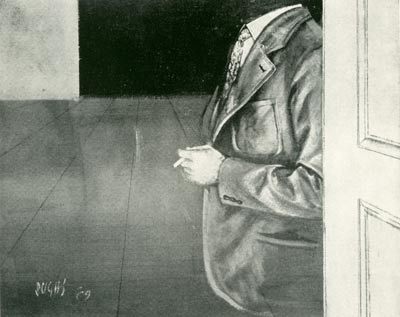 "... E' intorno a questi temi e al loro significato che, nel '69, Sughi propone un'altra serie di immagini, le immagini del " prete " e quelle in cui, sempre in termini allucinati e oggettivi, riprende i motivi dell'erotismo e della violenza. Il tema del " prete " si confonde col tema della " vocazione sbagliata ", la vocazione sbagliata che può costituire il dramma di qualsiasi intellettuale. Giuseppe Raimondi, che ha dedicato a Sughi in più di un'occasione una attenta e acuta analisi critica, ha dato anche di quest'ultimo ciclo una sicura interpretazione: " Se confrontiamo il probabile ordine ", egli ha scritto, " più di apparizione che di cronologia della favola, si può incominciare dal grande quadro del prete, giovane di fede e di pensieri, impavido e luminoso nei tratti del volto, accompagnato dalla figura, dolorosa di eventi, della vecchia madre che gli sta alle spalle. Quadro di efficacia drammatica, quasi ritagliata dalla scena riapparsa di anonima azione teatrale, giunta a noi da un luogo di solitudine per così dire atlantica. Sembra alludere, da quelle rive fuori del tempo, ad un momento di intensa sospensione quasi shakespiriana di comune vicenda di uomini. In due varianti di motivata eccezione pittorica, è il quadro con il ritratto per così dire oggettivato, cioè il busto, tagliato all'altezza del petto, del 'prete', ma, nei due dipinti, con espressione e tratti appena modificati nel viso, del prete ancora in giovane età. Lo sguardo fermo, il volto di forte evidenza plastica, quasi di Ritratto romano dell'epoca repubblicana. In ambedue i dipinti, il busto, il 'ritratto vivente' è racchiuso dentro la scatola di cartone di un imballaggio. L'uomo guarda perplesso in un peso di malinconia. Simbolico imballaggio, simbolico carcere di cartone. Il volto tinto di violetto spento, la scatola è gialla, la riuscita è quasi di emblematica natura morta. Non meno di quella, solo natura morta, che contiene, quasi ex-voto offerto al dono della Fede, le scarpe di pelle lucida, le fibbie d'argento squillante, del predestinato Prete. Altro 'modello' di prete è quello, già anziano ma vegeto nel sangue turgido, del prete (forse divenuto monsignore) cui appare, sul capo di giusta Religione, l'immagine, il fantasma in ispessore larvale, della Donna. Il pensiero del Peccato estinto in preghiere. E quello dell'imbavagliato prete, fasciato in bende da mummia stranamente contemporanea, cui la vigoria della Missione sembra splendere nel cristallo di grosse lenti a stanghetta. La serie potrebbe continuare, e continua in altri esemplari. Ma alla fine in un lungo quadro, appaiono due cassoni, due casse di legno grezzo puntato dai nodi e dai tarli. Potrebbero essere stati imballaggi, ma non lo sono più. Una è priva del contenuto cui sembrava predisposta. Nell'altra, in luogo dell'essere già vivente: povera carne da ridursi in polvere, sono cresciuti dei fogliami di splendido verde. Sono le foglie della pianta dei ficus, che tante volte ha 'decorato' i quadri di Sughi ". M. De Micheli