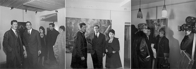Alberto Sughi con Pietro Germi, Lina Sughi, Monica Vitti, Alida Chelli, all'inaugurazione della Personale di Alberto Sughi alla Nuova Pesa, Roma, 1961
