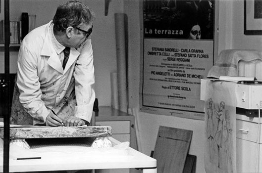 Alberto Sughi mentre lavora ad una litografia nel suo studio di via del Circo Massimo, sullo sfondo e riprodotto nel riquadro di destra , si vede il manifesto con un dipinto della Cena per il film la La Terrazza di Ettore Scola.