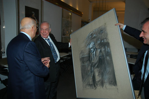 Alberto Sughi con Giorgio Napolitano e Pasquale Cascella, per la presentazione del ritratto di Sughi in occasione dell'ottantesimo compleanno di Napolitano, Roma 2005