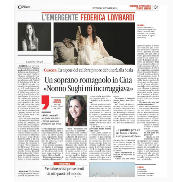 Claudia Rocchi, L'emergente Federica Lombardi, in Corriere di Romagna, 20 Settembre 2016, pag. 31