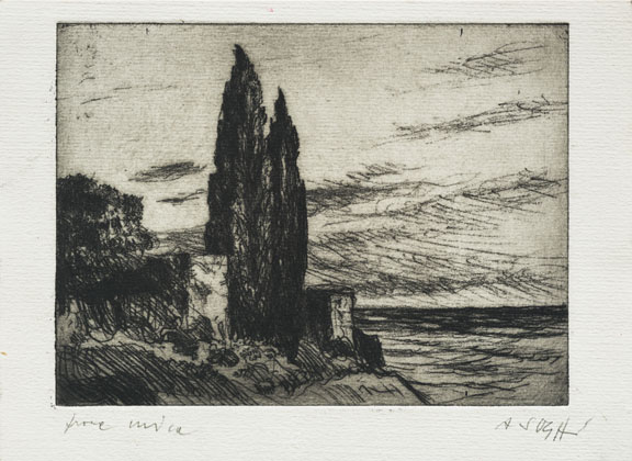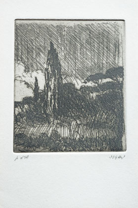 Paesaggio con pini e cipressi, anni 80, Acquaforte
