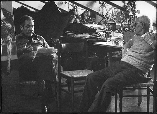 Alberto Sughi con lo scrittore Giuseppe Raimondi, nello studio di Carpineta di Cesena, 1977